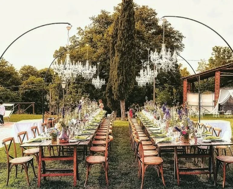 The venue style of Villa Le Querce is best described as rustic elegance with historic charm. The 17th-century Tuscan farmhouse has been beautifully restored, blending authentic architectural elements like exposed wooden beams, terracotta floors, and antique oak furniture with modern comforts. The villa’s expansive gardens, saltwater pool, and panoramic countryside views create a serene and luxurious atmosphere, making it ideal for romantic weddings, elegant receptions, and intimate celebrations. Whether hosting an outdoor ceremony under ancient oaks or a refined indoor event in its spacious halls